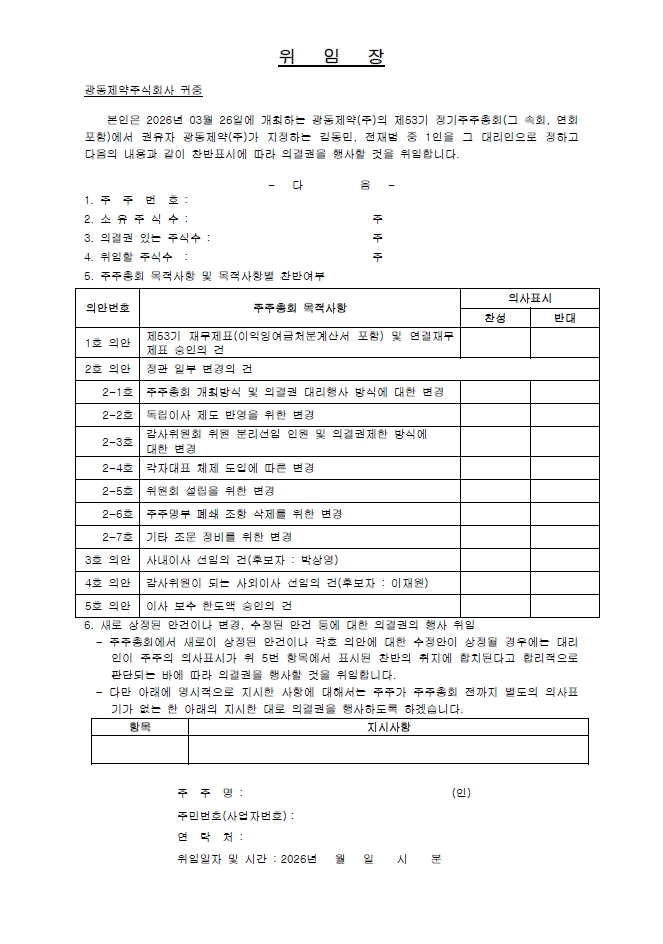 ▶ 위임장 접수처·주 소 : 경기도 과천시 과천대로7다길 52(갈현동, 광동 과천 타워) 광동제약 자금팀 (우편번호 13840)